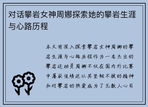 本文专访了网球界新星赵娜,探寻她在网球领域取得成功的秘诀与心路历程。通过对赵娜的深度采访,我们了解到她从小对网球的热爱、刻苦训练以及面对困难时的不屈精神,这些都成为她职业生涯的重要支撑。文章将从四个方面详细阐述:首先是赵娜的早期经历与网球启蒙;其次是她在职业生涯中的关键决策与转折点;再者是她对训练和...